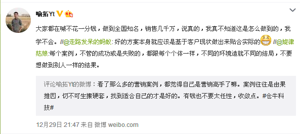 在昨天晚上,看到微博里知名自媒體人喻拓Yt發(fā)表了一條微博:看了那么多的營(yíng)銷(xiāo)案例,都覺(jué)得自己是營(yíng)銷(xiāo)高手了嘛。案例往往是由果推因,切不可生搬硬套,找到適合自己的才是好的。有錢(qián)也不要太任性,收斂點(diǎn)。微博發(fā)出后引起了大家的評論,后來(lái)喻拓Yt又評論轉發(fā)了一句:大家都在喊不花一分錢(qián),做到全國知名,銷(xiāo)售幾千萬(wàn),說(shuō)真的,我真不知道這是怎么做到的,我學(xué)不會(huì )。