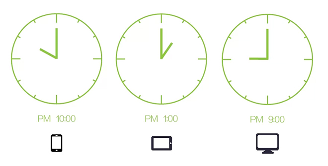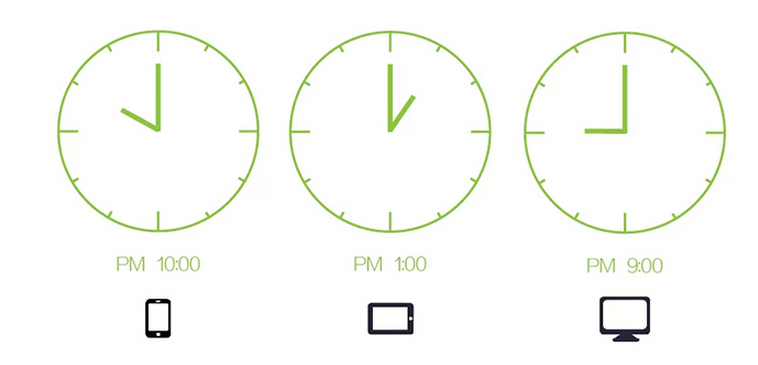 手機端分享最高峰在晚上10點(diǎn) ; 平板端分享最高峰在下午1點(diǎn); 臺式機和筆記本分享最高峰在晚上9點(diǎn)