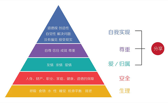 根據馬斯洛需求層次理論(下圖),每個(gè)人自下而上都有對“生理、安全、愛(ài)和歸屬、尊重、自我實(shí)現”5種層次的需求,并且,人們只有對低層次的需求得到滿(mǎn)足后,才會(huì )追求更高一層級的需求;而“分享”就是人在得到“生理、安全”這兩種層次需求的滿(mǎn)足后,進(jìn)而追求其它三種更高層次需求時(shí)所表現的一種行為。