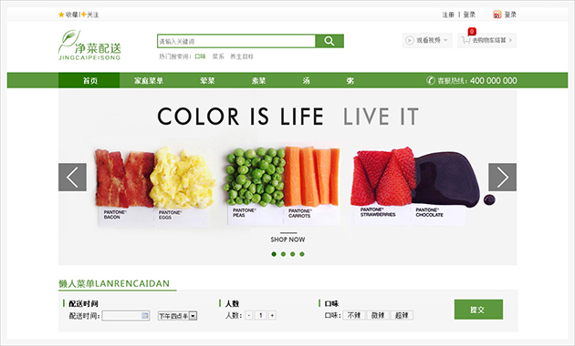 優(yōu)化前網(wǎng)頁(yè)主色調是綠色,綠色給人的感覺(jué)雖然干凈清爽,但是對于食品類(lèi)電子商務(wù)網(wǎng)頁(yè)來(lái)說(shuō)卻沒(méi)有營(yíng)造出溫暖熱烈的氛圍。