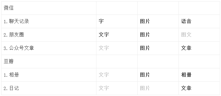 豆瓣中,“最小單位”是產(chǎn)品中信息生產(chǎn)的基本格式。相冊(相冊中的每一張圖片可以單獨瀏覽并進(jìn)行收藏)、日記文章。微信中,“最小單位”是文字、圖片、語(yǔ)音、視頻信息的基礎層級,你可以單獨收藏朋友圈中的文字、圖片,微信公眾號文章里的圖片。