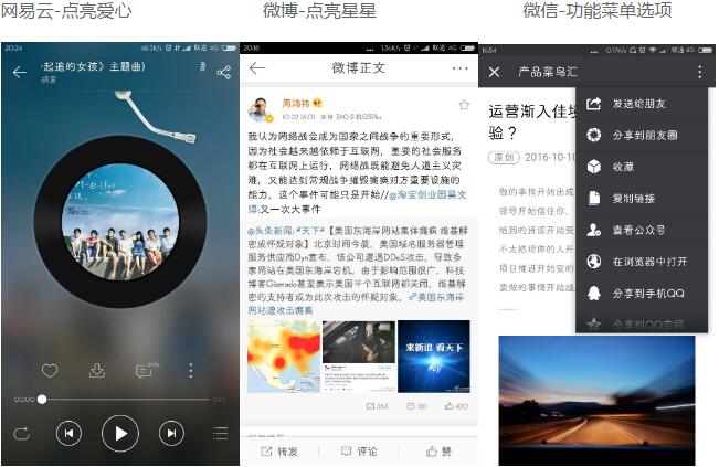 豆瓣中,添加收藏會(huì )進(jìn)行計數,這個(gè)“收藏”數據很大程度上成為了這個(gè)信息“被贊同”的評價(jià),用戶(hù)對信息的第一印象很難不受此數據的影響;微博中,點(diǎn)亮星星純粹是作為添加收藏的功能鍵以及作為“已收藏”的標識,下方tab功能欄可以進(jìn)行點(diǎn)贊,對信息進(jìn)行評價(jià)。