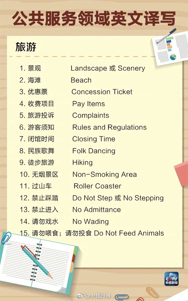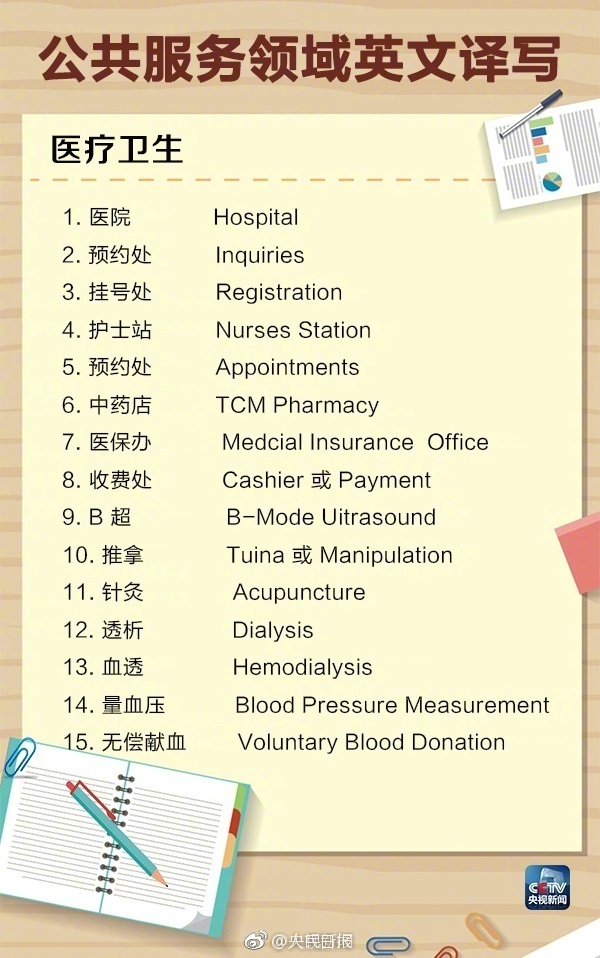 下面是央視提供的公共服務(wù)領(lǐng)域英文譯寫(xiě),同時(shí)回答一下標題當中出現的三個(gè)事物的標準英文翻譯: