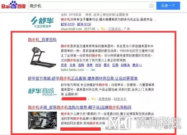 接下來(lái),我們通過(guò)搜索關(guān)鍵詞“跑步機”,來(lái)分析一下第一頁(yè),有哪些需求展示,(注明:根據搜索引擎的原則,誰(shuí)能更好的解決用戶(hù)需求,誰(shuí)就排名靠前)如下圖所示: