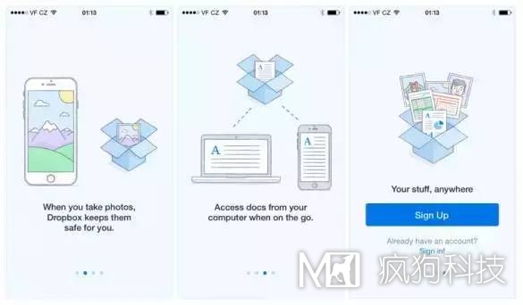 分步導航也可以用來(lái)引導用戶(hù)了解一個(gè)應用或服務(wù)的功能。如果步驟不多,也可以使用小圓點(diǎn)來(lái)表示(就像下圖Dropbox的例子)。